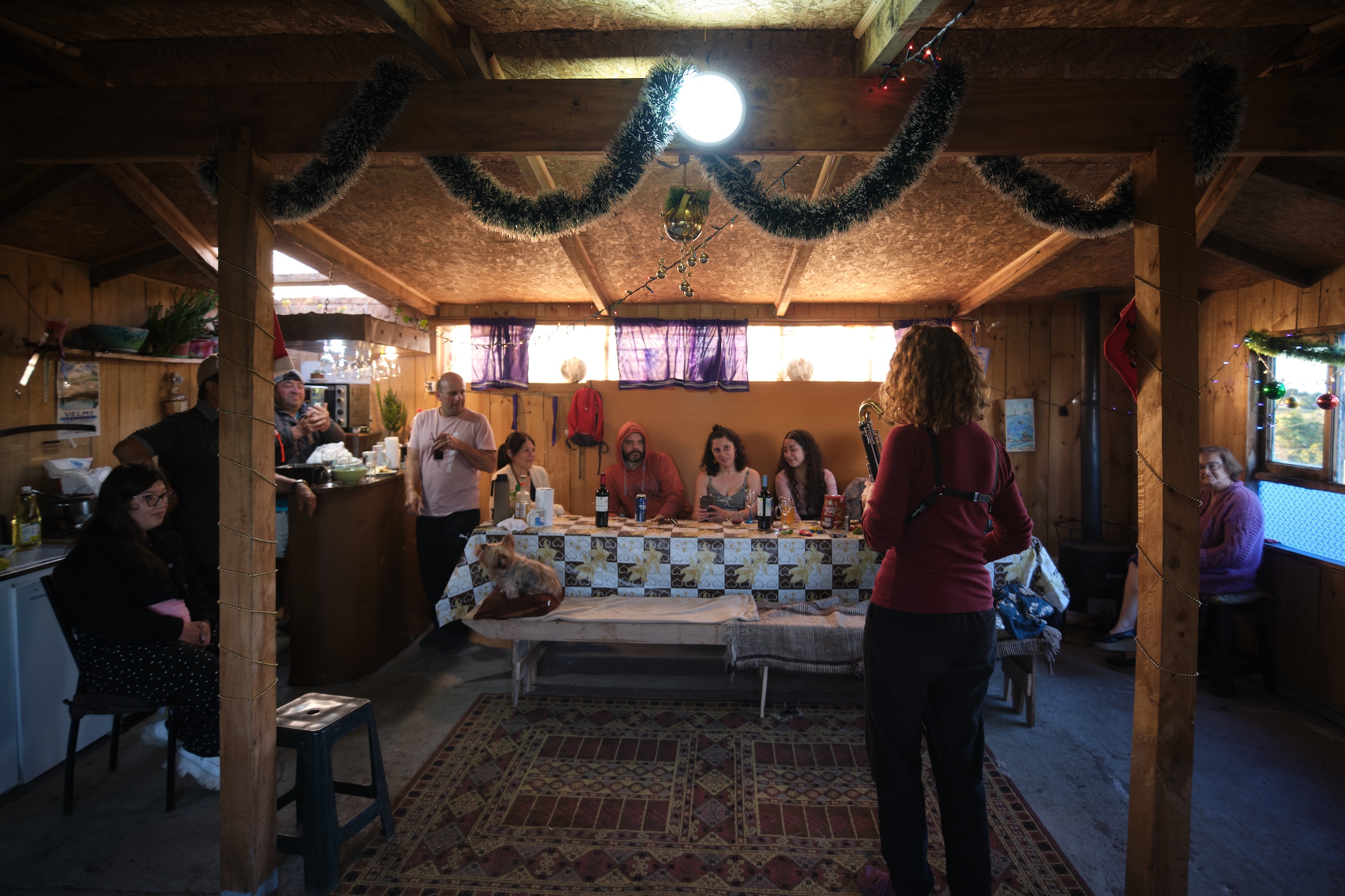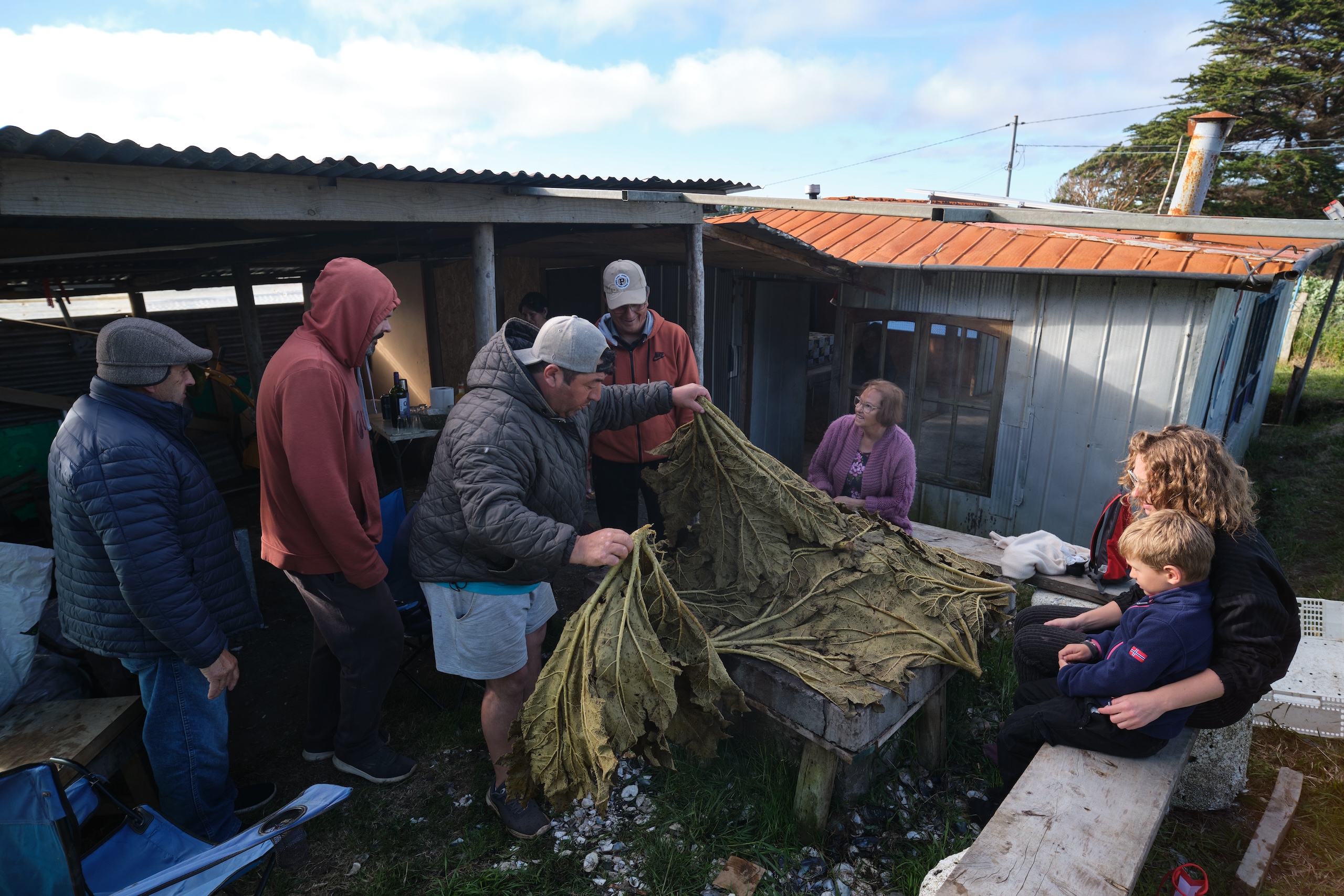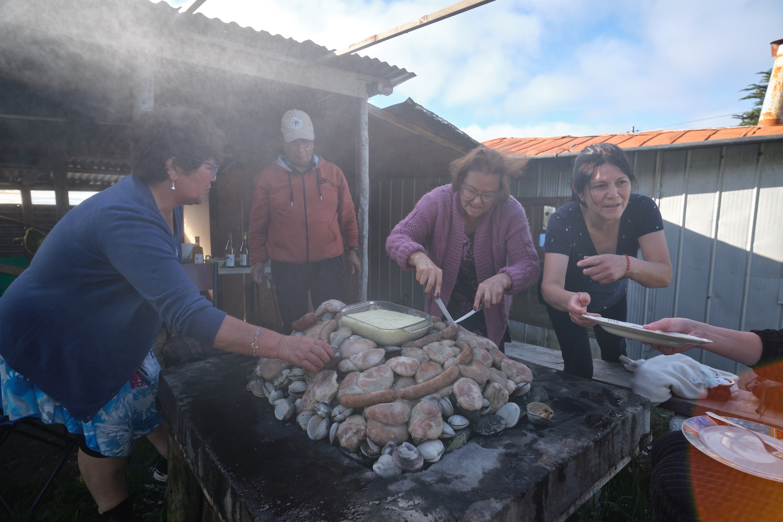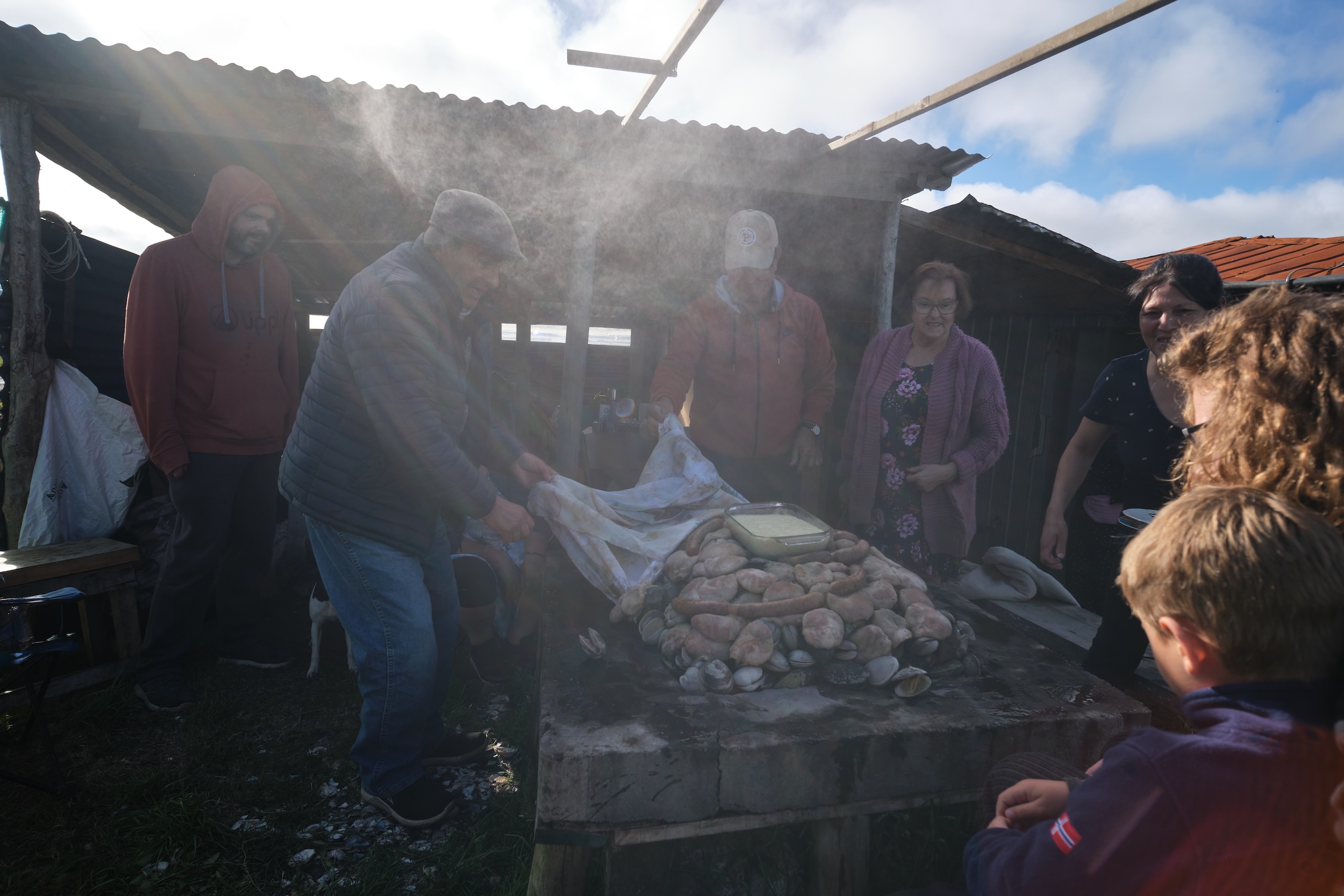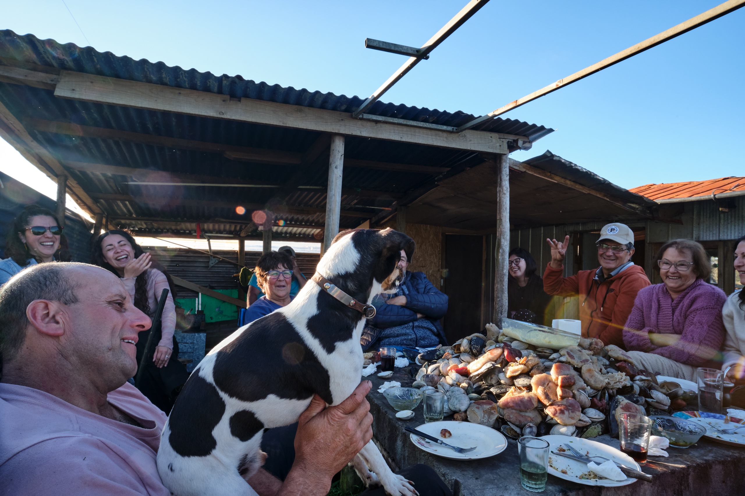 Paula took us to her neighbours’ house where we went straight to the garden next to the sheep pasture. On top of an open fire place, there was a huge pile covered with enormous leaves. The women directed us where to take place around the big pile and the men gesticulated Sebastian that now was the moment to take pictures as they were going to lift the secret and uncover the pile. With each leave gone, we discovered that underneath was an incredible amount of mussels of different kinds, sausages, meat, two kinds of potato dumplings and on top a tray full of melted (sheep) cheese. Everybody was sitting around the Curanto, eating, and throwing shells on the ground. You could truly feel and see how proud they were to introduce us to their traditions and specialities, including piure, one of the most bizarre creatures we have ever seen or tasted. Even though nobody spoke a word English, we had an amazing time together, experiencing our own “Zu Tisch” episode. As the night moved on, we were offered a lot of wine to drink and tried to explain our journey and what we do with our broken Spanish. Finally, I even went to get my bass clarinet and introduced everyone to some of our traditional music as well as contemporary improvisation. But the party just started, and we celebrated Christmas the Chilean way with a lot of dancing to rancheras instead of a holy silent night.